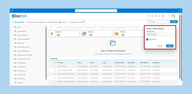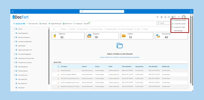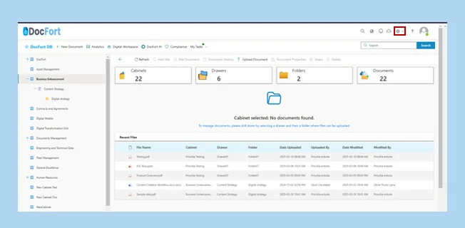 Cabinets can be added and deleted at any time. To create cabinets, Click on the Settings icon at the top right of the Landing page. See the image below for reference.