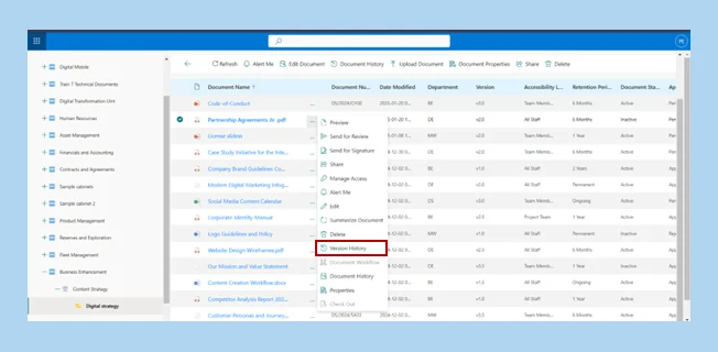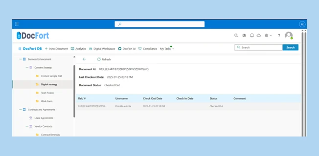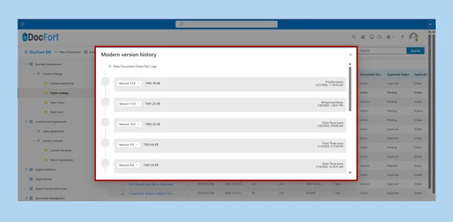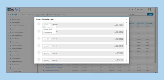 Have complete control over every version of the document uploaded by you. Restore, Delete and Download document versions to suit your needs. Also you have access to check out logs of each document and compare multiple versions together with ease on our DocFort.