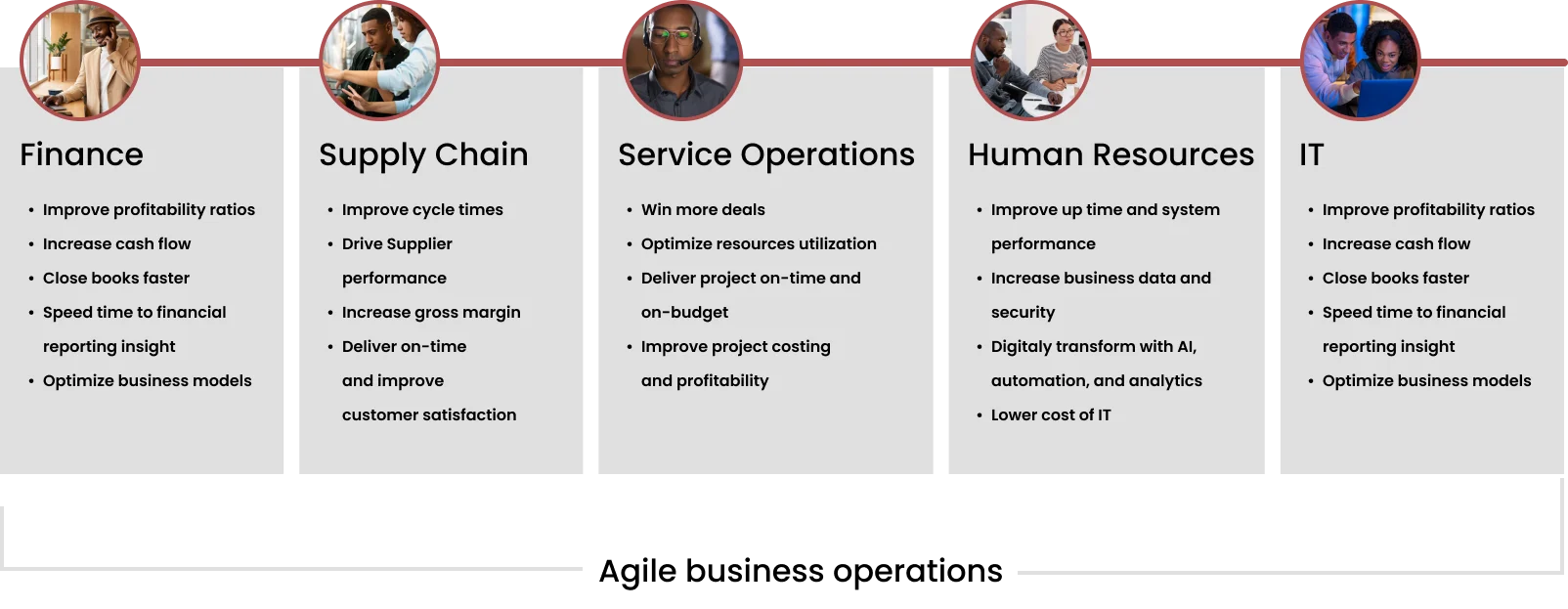 Unify financial and business operations data combined with built-in predictive analytics and intelligence to help you get deeper business insights to improve financial controls. Accelerate cashflow, reduce days sales outstanding, and achieve corporate compliance. Better anticipate business needs, increase forecasting accuracy, and drive corporate strategy and growth.
