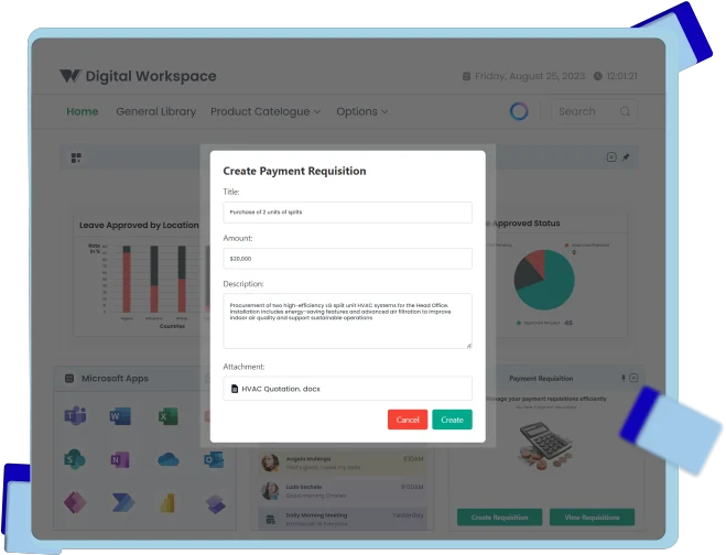 Built on the foundation of Microsoft SharePoint Online, Digital Workspace is a modern productivity platform where all business tools are converged for centralized access and simplified experience. The Digital Workspace also provides for elaborate mechanism for envisioning, digitizing, automating, and onboarding new business processes at the speed on thought.