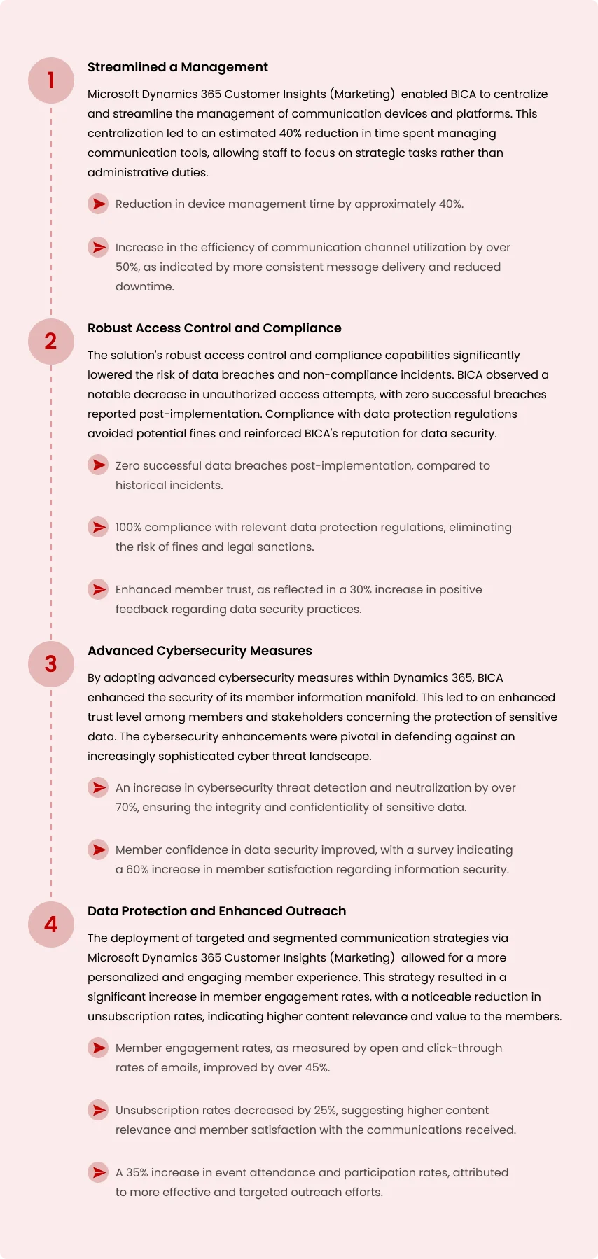 By adopting advanced cybersecurity measures within Dynamics 365, BICA enhanced the security of its member information manifold. This led to an enhanced trust level among members and stakeholders concerning the protection of sensitive data. The cybersecurity enhancements were pivotal in defending against an increasingly sophisticated cyber threat landscape.
