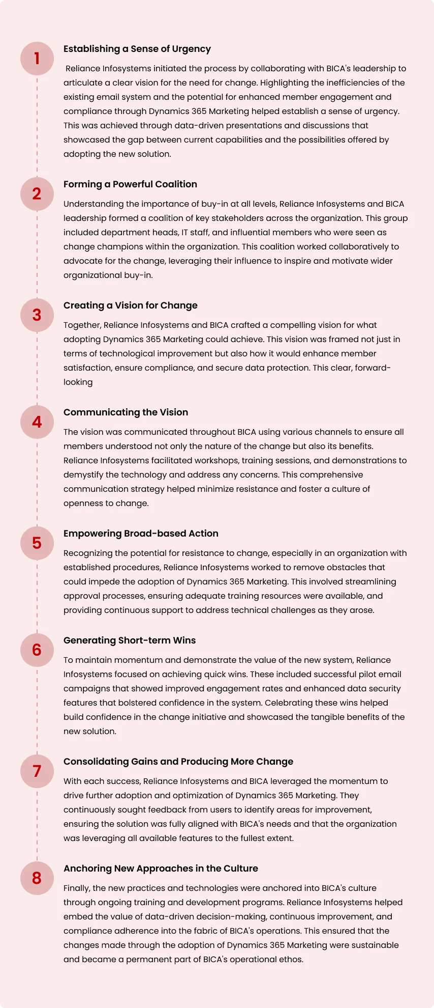 Reliance Infosystems initiated the process by collaborating with BICA's leadership to articulate a clear vision for the need for change. Highlighting the inefficiencies of the existing email system and the potential for enhanced member engagement and compliance through Dynamics 365 Marketing helped establish a sense of urgency. This was achieved through data-driven presentations and discussions that showcased the gap between current capabilities and the possibilities offered by adopting the new solution.